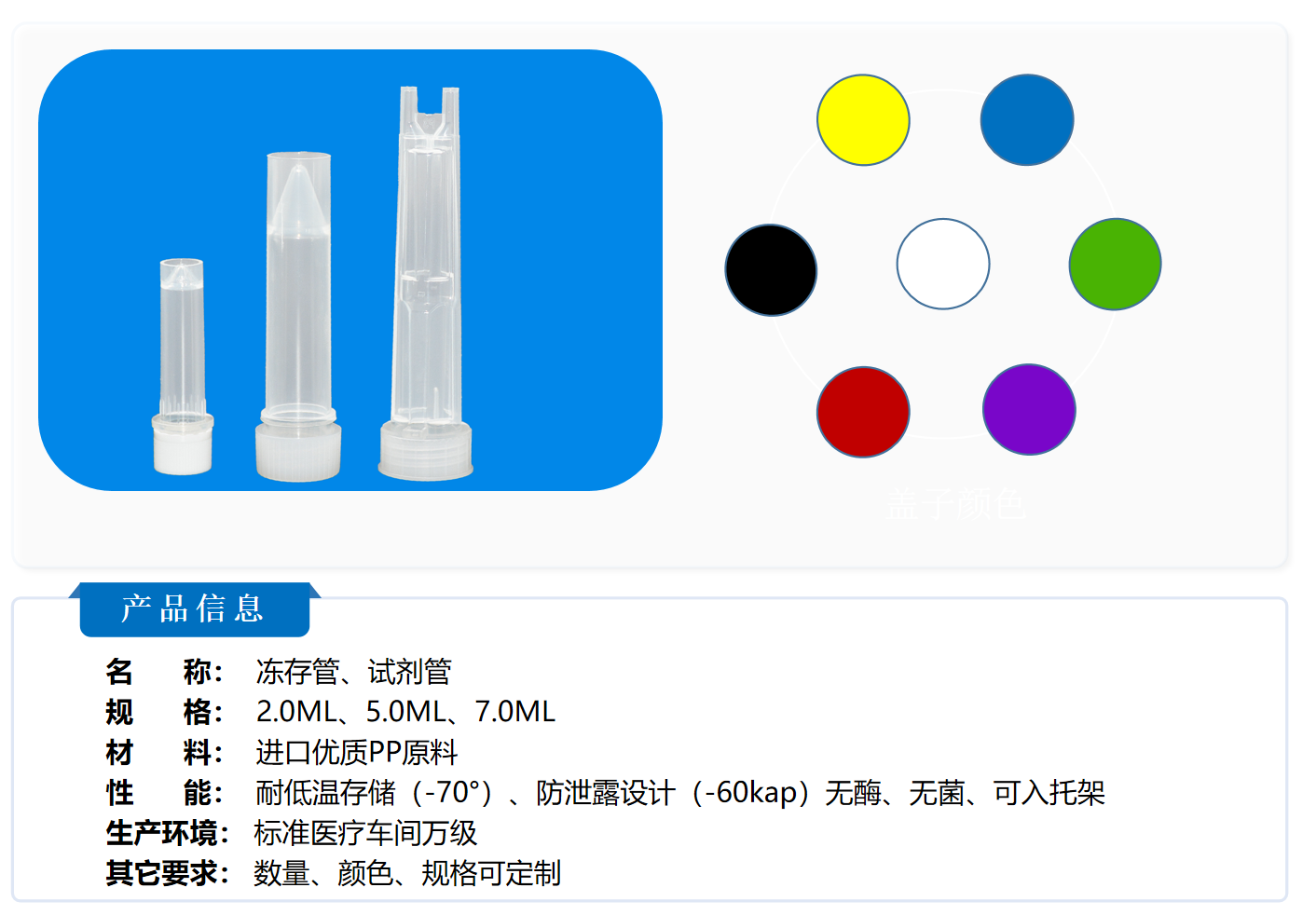 性 能: 耐低温存储(-70°)、防泄露设计(-60kap)无酶、无菌、可入托架
